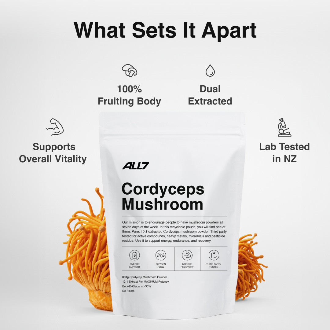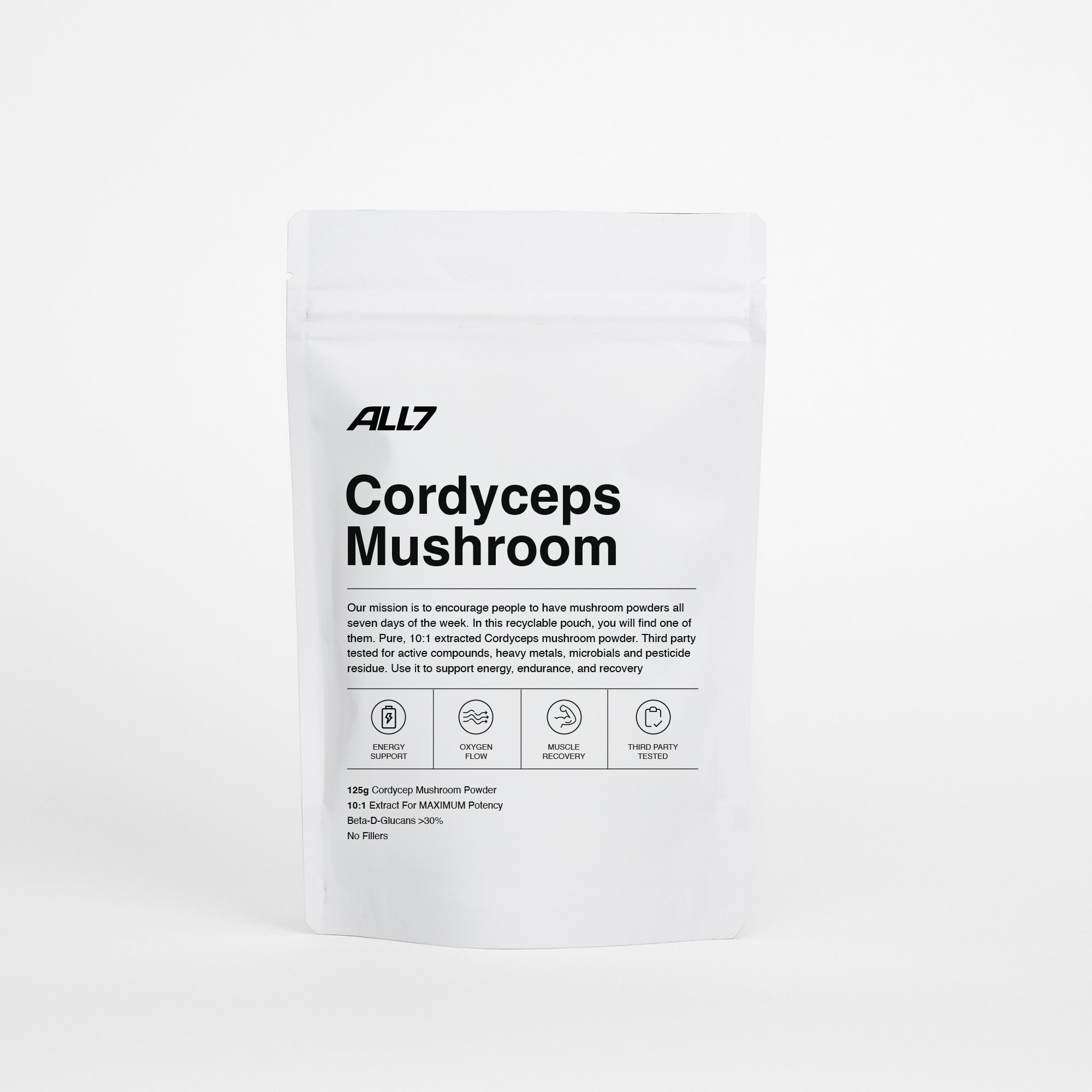 ALL7 Cordyceps is a premium, high-potency mushroom powder designed for flexible, everyday use. It supports natural energy, stamina, and overall vitality — without relying on stimulants. It’s available in both 125g and 300g pouches, giving you options to suit your routine.