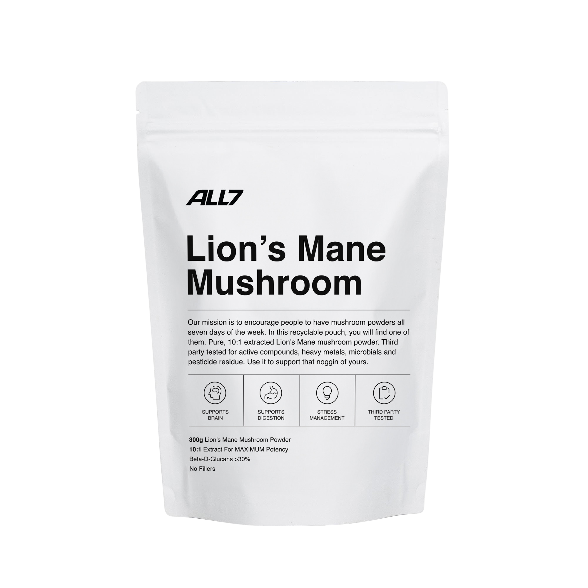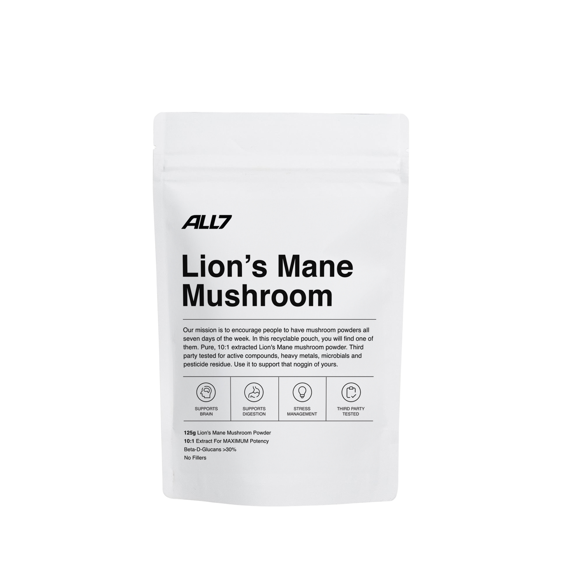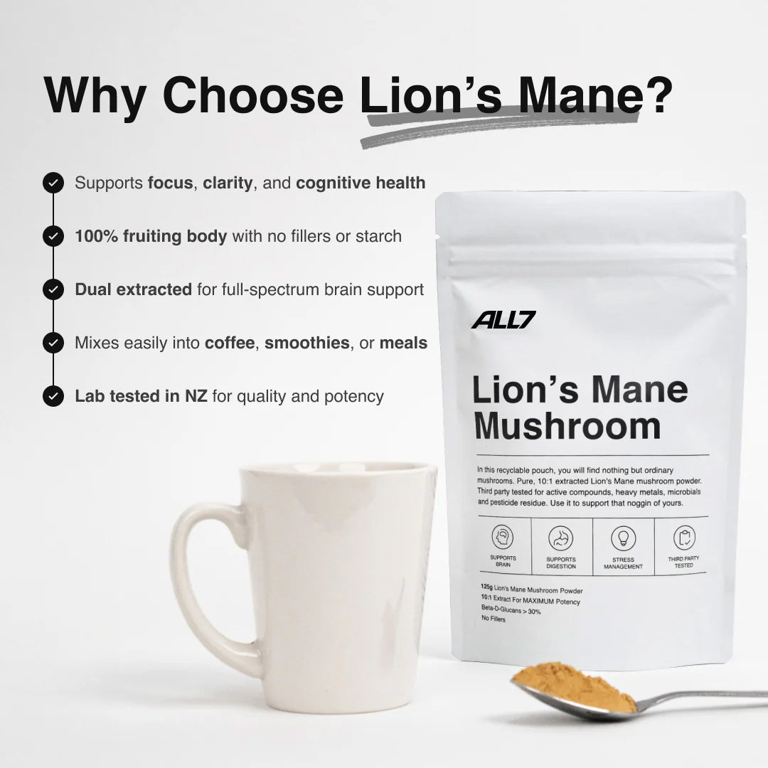 ALL7 Lion’s Mane is a premium, high-potency mushroom powder crafted to provide flexibility in how you incorporate this well-loved mushroom into your routine. It’s available in both 125g and 300g pouches, perfect for different needs.