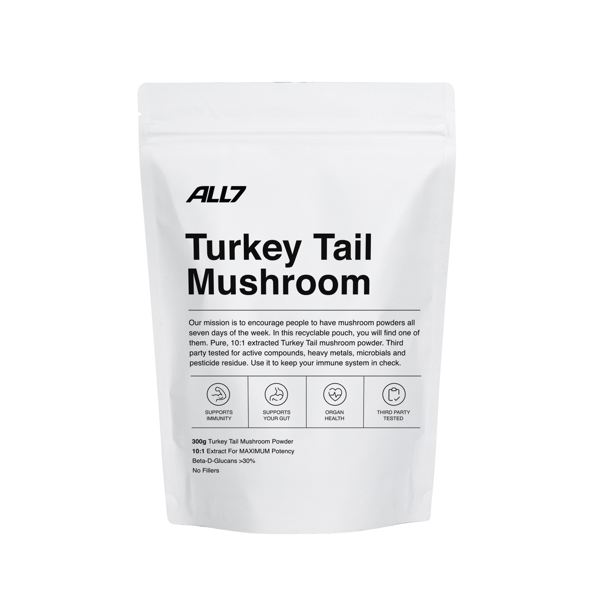 At ALL7, we’re dedicated to supplying potent mushroom powders that deliver on their promises. Our Turkey Tail powder is 10:1 dual extracted, with high (>30%) levels of beta-d-glucans. No fillers. No nasties. Only pure, undiluted Turkey Tail for maximum effect.